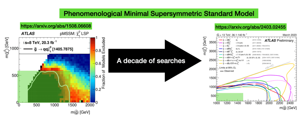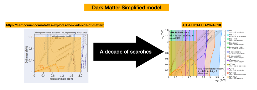 Instead of giving a laundry-list of recent results (each of the 8 new ATLAS results had their own, dedicated presentation), I decided to focus on the big picture. One of the points I wanted to highlight was on how far we’ve come in the last decade, when folks started to realise that exotic long-lived new particles could be in a blind spot. So I did some archaeology and made a timeline of how summary plots (which show the results of different searches on the same plot to give an at-a-glance summary of the experimental status on a given topic) have progressed in the last 10 years.