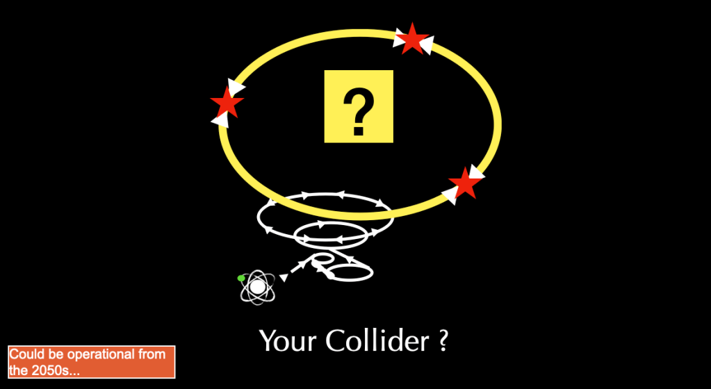 I explain to them that the yellow ring represents a new collider. But that in the 2050s, I will be approaching retirement. It won’t be me exploiting that machine.